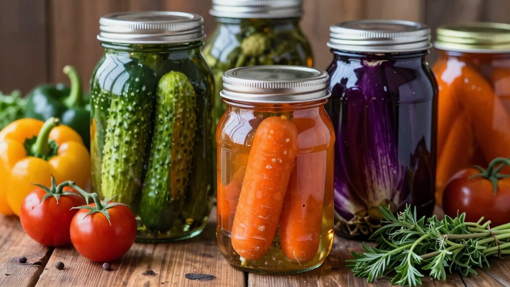 Ever wondered how to transform fresh vegetables into delicious, shelf-stable jars? The secret lies in mastering pickling and canning techniques that preserve flavors while guaranteeing safety. To start, you’ll need to understand fermentation techniques—an ancient method that uses natural microbes to convert sugars into acids, creating tangy, probiotic-rich foods. This process not only enhances flavor but also boosts the nutritional profile of your preserved produce. When fermenting, it’s essential to maintain proper conditions: keep your vegetables submerged in brine, use a fermentation vessel that allows gases to escape, and store everything at consistent, cool temperatures. These steps help prevent mold and spoilage, resulting in vibrant, flavorful jars that can last months.