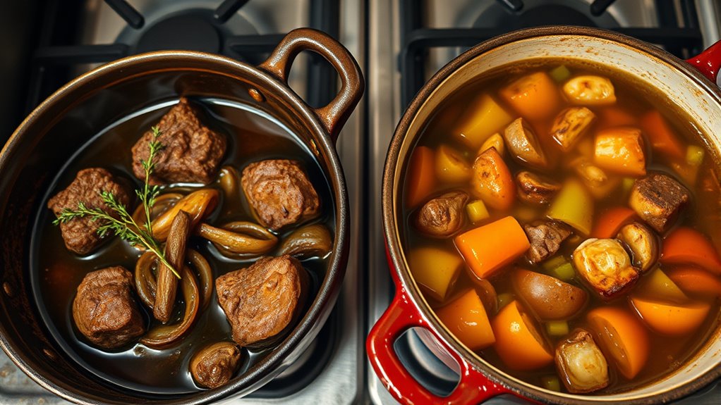 Braising and stewing are both slow-cooking methods that make your meals tender and flavorful, but they differ in technique. Braising involves cooking larger, tougher cuts at lower temperatures (275°F to 325°F) for longer periods, resulting in fall-apart meat with rich sauces. Stewing uses smaller pieces, cooked at slightly higher temperatures (200°F to 250°F), for a shorter time, yielding uniformly tender bites in a thick broth. Learn more to perfect each method for your favorite dishes.
