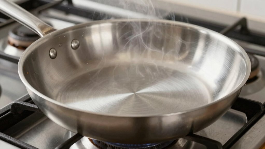 Now, consider your pan material. Different materials conduct heat differently, affecting how quickly and evenly your pan heats up. Cast iron and carbon steel pans are excellent choices because they heat evenly and retain heat well, making them ideal for searing. Non-stick pans, while great for delicate foods, often don’t reach the high temperatures needed for a good sear and can have uneven heat distribution. Aluminum pans heat quickly but might not retain that heat as well, so preheating becomes even more vital to guarantee consistent searing. When you preheat the pan properly, you help guarantee that heat spreads uniformly across the surface, preventing hot spots that can cause uneven browning or burning.
