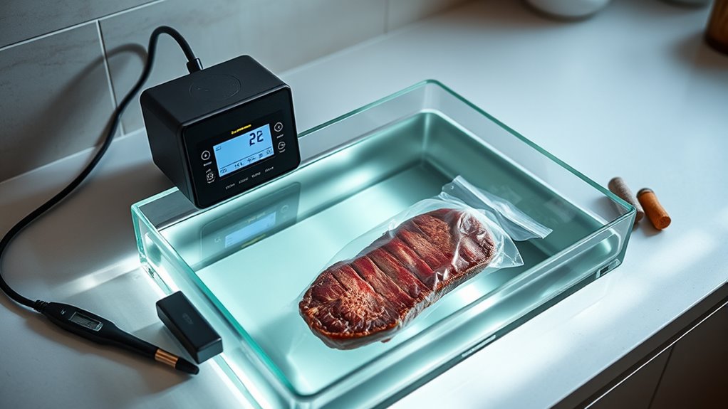 Ever wondered how to keep your sous vide safe? You should always prioritize vacuum safety by ensuring your bags are properly sealed to prevent water leaks. Monitor water temperature carefully, as maintaining the right heat prevents bacteria growth and guarantees even cooking. Keep your equipment clean and follow manufacturer instructions to avoid electrical hazards. Isn’t safety the secret to perfect, worry-free sous vide cooking? Stay vigilant, and enjoy delicious results!