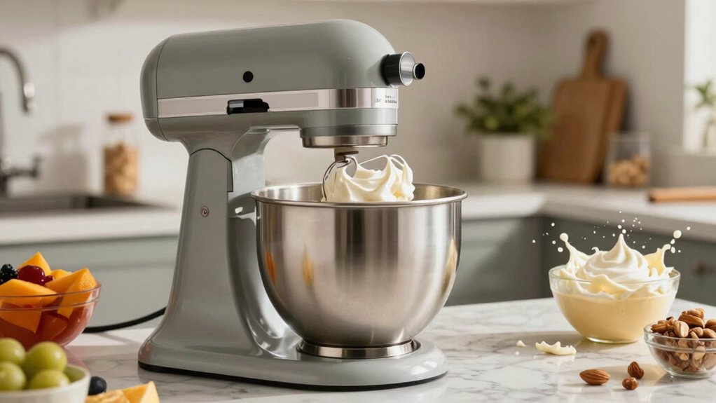 If you’re tight on space, a stand mixer can still be your kitchen’s Swiss Army knife. Its countertop convenience means you get appliance versatility without sacrificing precious room. Compact models fit snugly, turning your small kitchen into a hub of culinary creativity. With the right choice, you’ll enjoy powerful performance and multi-tasking magic, proving that even tiny kitchens can wield big culinary tools.