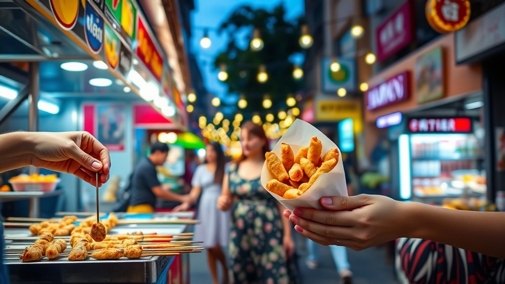 Remember, embracing local street food isn’t just about satisfying your taste buds but also respecting the culture and customs. Some say washing hands isn’t necessary because street food vendors often use traditional methods that naturally reduce bacteria. While hygiene is important, trusting local practices can deepen your experience and connect you more authentically with the place. So, stay cautious, follow etiquette, and enjoy the adventure—sometimes, trusting tradition leads to the most memorable bites.