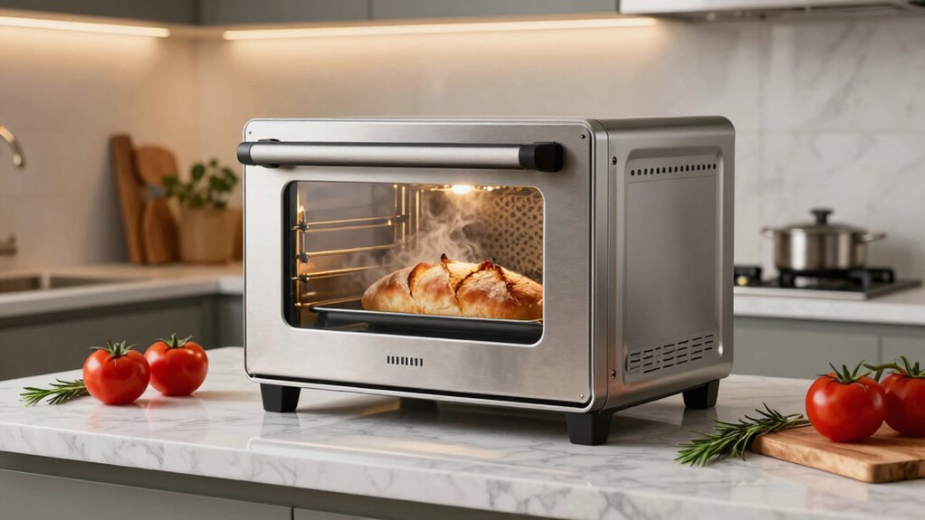 Modern countertop ovens act as vigilant guardians in your kitchen, safeguarding your culinary adventures. They include safety features like temperature regulation to prevent overheating and safety sensors that automatically shut off the oven if it detects issues. These features guarantee your cooking is not only precise but also safe, giving you peace of mind while you focus on creating delicious meals. With these safety measures, your countertop oven becomes a reliable kitchen companion.