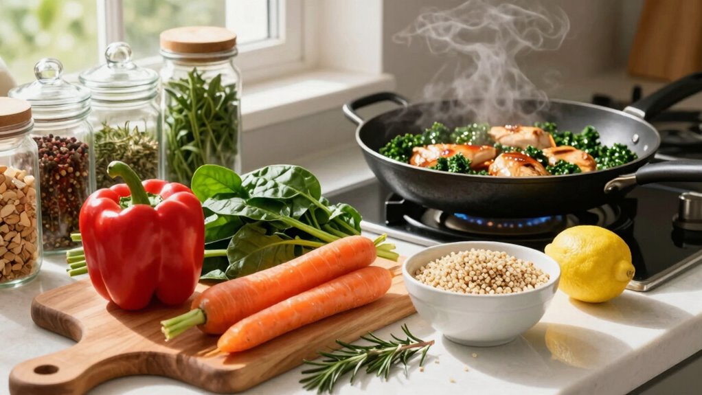 Time saving techniques are essential in a busy kitchen. Use appliances like slow cookers or instant pots to cook meals with minimal effort. These tools allow you to set everything up in the morning or the night before, then come home to a hot, nutritious dish. Additionally, utilizing one-pan or one-pot recipes reduces clean-up time and simplifies cooking. When you’re in a rush, don’t forget to leverage shortcuts such as pre-made sauces, seasonings, or pre-cooked ingredients, which can add flavor without extra prep. Incorporating these methods ensures you can maintain a healthy diet without sacrificing precious time. Moreover, investing in versatile kitchen tools can help you prepare a variety of meals quickly and efficiently. Ultimately, healthy cooking in a busy kitchen isn’t about perfection; it’s about making smarter choices that align with your schedule. By adopting effective meal prep strategies and time saving techniques, you empower yourself to eat well even on your busiest days. Understanding the importance of meal prep can help you develop a sustainable approach to healthy eating. You’ll find that with a little planning and some clever shortcuts, nourishing yourself becomes less of a hassle and more of a sustainable part of your lifestyle.