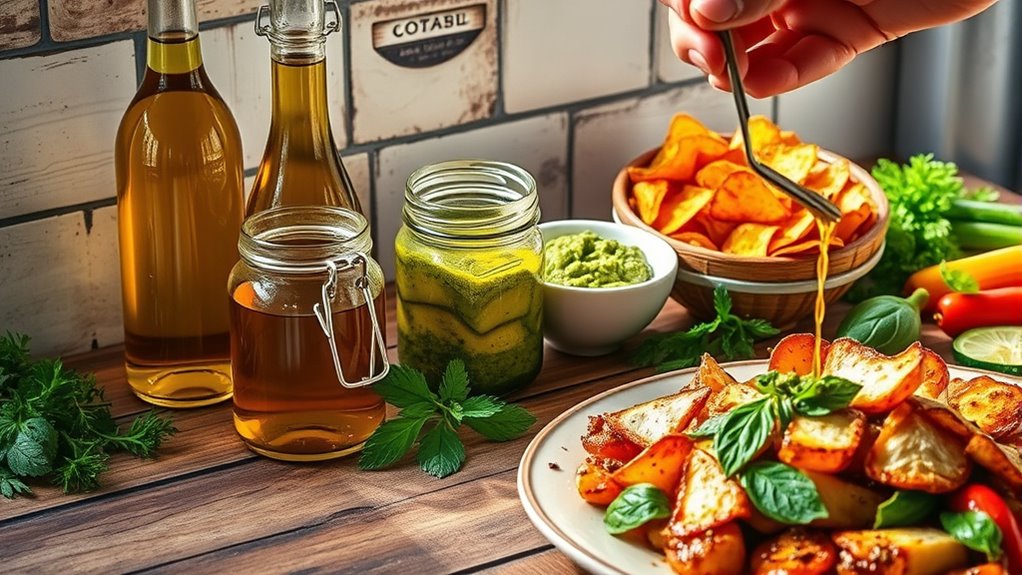 Choosing healthy fats like olive and avocado oils can boost your cooking by adding rich flavor and nutritional benefits. Olive oil is great for dressings and finishing dishes, while avocado oil’s high smoke point makes it perfect for high-heat cooking. Both oils provide monounsaturated fats that support heart health and reduce inflammation. Incorporating these oils wisely can make your meals more delicious and nourishing—keep going to discover how to use them effectively in your kitchen.