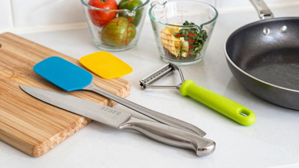 Imagine blending affordability with functionality—these essential cooking utensils and affordable kitchen gadgets are perfect for healthy eating on a budget. A good non-stick pan, a sharp paring knife, and a versatile vegetable peeler cost little but make meal prep easier. Look for multi-use tools like a steamer basket or a silicone spatula. These budget-friendly options help you cook nutritious meals without overspending, making healthy cooking simple and accessible.