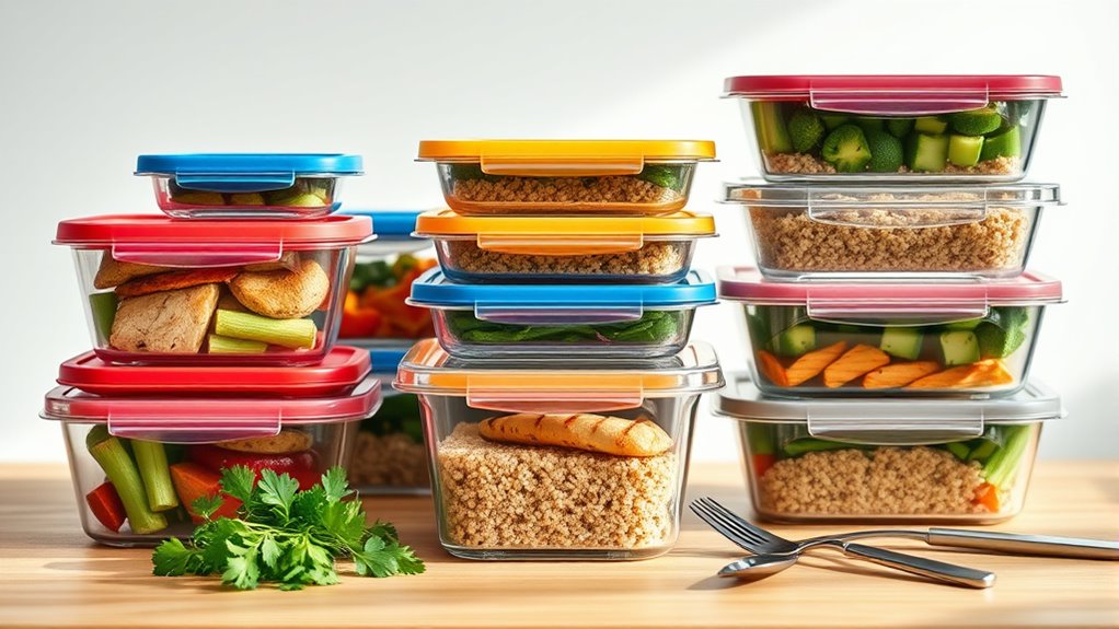 You want the best leak-proof containers, so look for ones with strong leak-proof seals to prevent spills. Materials like high-quality BPA-free plastic and stainless steel are ideal because they offer excellent container durability, resisting cracks and dents over time. These options guarantee your food stays fresh and secure during transport. Choose containers with tight-fitting lids and durable construction to keep your meal prep leak-proof and reliable.