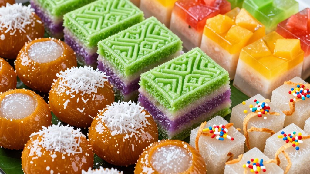 If you have a sweet tooth, Indonesia offers a rich variety of desserts to try. You can enjoy colorful, layered kue lapis, chewy dodol caramel treats, and flavorful onde-onde filled with mung bean paste and coated in sesame seeds. Each dessert reflects regional ingredients and traditions, showcasing vibrant flavors and textures. Exploring these treats gives you a taste of Indonesia’s cultural heritage. Keep exploring to discover more delicious Indonesian sweets that will satisfy your cravings.
