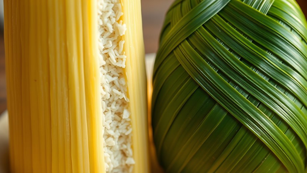 Lontong and ketupat are both traditional rice dishes, but they differ in preparation. Lontong is made by soaking, boiling, and wrapping rice in banana leaves, resulting in a firm, block-like shape. Ketupat involves packing rice into woven palm or coconut leaves and weaving them into intricate shapes before boiling. If you’re curious about how these methods connect to cultural meanings and ceremonies, keep exploring the fascinating differences.