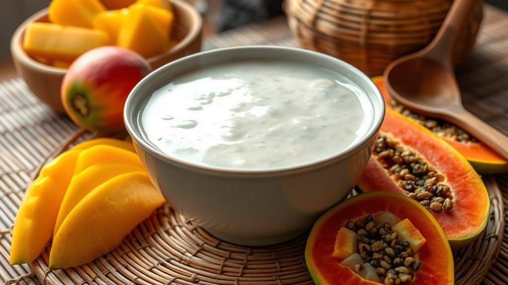 When savoring flavors of papeda, you’ll find that common side dishes often include rich, savory options like spicy fish stews, grilled seafood, or tangy vegetables. These cultural pairings complement the porridge’s mild, starchy taste perfectly. You might also enjoy adding lime or chili for extra zest. Such pairings highlight the region’s culinary diversity and deepen your appreciation for the traditional flavors that define Eastern Indonesia.