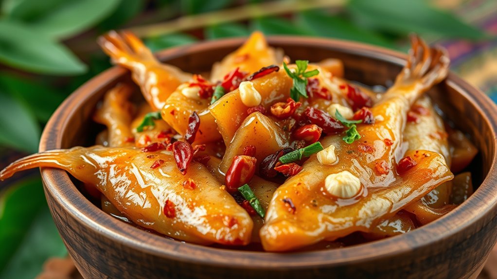 As you savor pekasam, it’s like tasting a piece of tradition that’s been lovingly aged, revealing flavors as rich as a storyteller’s tale. This fermented fish delicacy isn’t just food; it’s a journey through time and culture, inviting you to appreciate the art of fermentation. So, next time you enjoy pekasam, remember—you’re biting into a piece of history, as vibrant and enduring as a heartbeat echoing through generations.