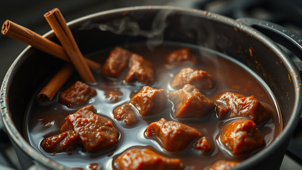You’ll find that the slow simmer considerably improves meat texture by breaking down connective tissues, making the meat tender and flavorful. The extended cooking duration allows heat to penetrate evenly, ensuring every piece of meat becomes soft and juicy. As you continue simmering, the meat absorbs spices better, enhancing taste while achieving a melt-in-your-mouth consistency. This slow process transforms tough cuts into a delicious, tender dish you’ll enjoy every time.