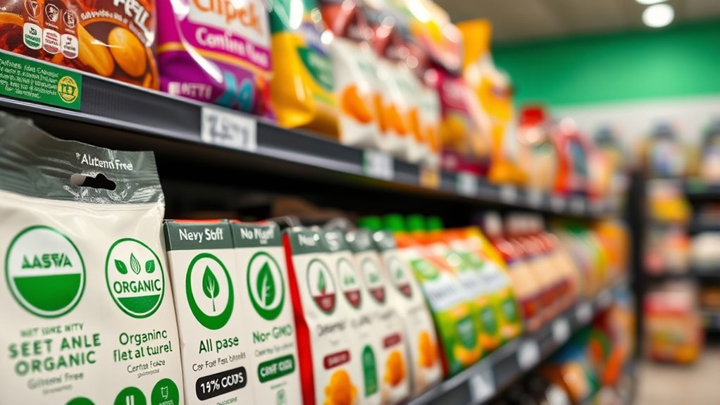 When you see labels like organic, non-GMO, or other claims, it’s important to understand their meaning. Organic labels indicate the product was produced without synthetic chemicals and adheres to strict environmental standards. Non-GMO labels show the product doesn’t contain genetically modified organisms. Additional claims like “free-range” or “grass-fed” provide insights into animal farming practices. By understanding these labels, you can make healthier, more ethical choices—if you keep exploring, you’ll discover how to decode these labels even better.