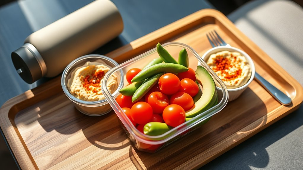 To stay healthy on a busy schedule, plan and prepare nutritious meals and snacks ahead of time. Keep portable options like nuts, fruits, or trail mix with you for quick energy and to prevent unhealthy temptations. Organize your fridge and pantry with wholesome ingredients so healthy choices are easily accessible. Dedicate some time each week to meal prep, and you’ll find it easier to stick to balanced eating even on hectic days—there’s more to discover on how to make it work seamlessly.