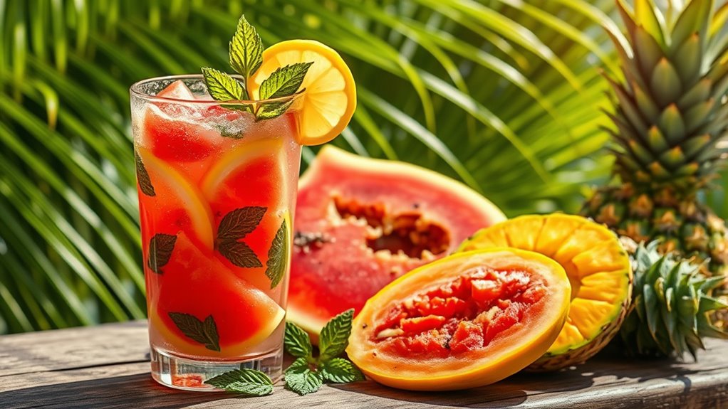 Incorporating juice-rich foods into your diet can also help you stay hydrated, especially in tropical climates where fluid loss is common. Combining electrolyte drinks with hydrating foods creates a thorough approach to hydration that’s practical and effective in tropical climates. For example, sipping on an electrolyte-infused beverage after a workout, paired with a fruit salad or veggie sticks, can help you recover faster and sustain your energy levels longer. It’s also a smart idea to carry portable, hydrating snacks like sliced fruits or electrolyte powder packets when you’re out and about in the heat. By making these small adjustments, you guarantee your body gets the fluids and minerals it needs to perform at its best despite the intense climate.