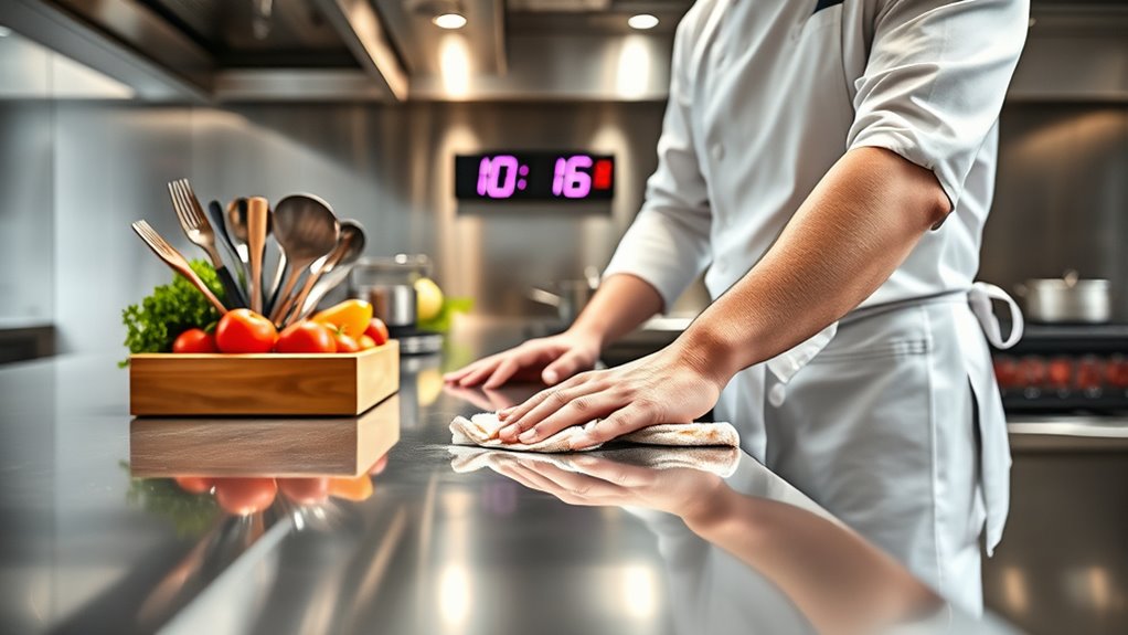 Did you know that managing just 5 minutes of cleanup every hour can boost your kitchen’s efficiency by 30%? During busy days, it’s vital to perform quick cleanups frequently to maintain high cleanliness standards. By dedicating short, consistent intervals, you improve time management and keep chaos at bay. This routine ensures your workspace stays organized, safe, and ready for the next task, even during the busiest shifts.