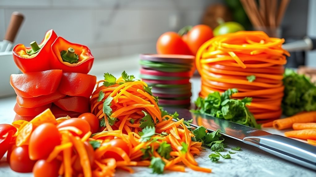 Discover no-chop veggie shortcuts that can save you time and effort in the kitchen. Using tools like vegetable spiralizers, mandoline slicers, and high-quality food processors, you can prepare vegetables quickly and uniformly without chopping. Pre-cut vegetables from the store also help keep prep simple. These tricks keep your meals fresh and visually appealing, making cooking easier and more enjoyable. Keep going, and you’ll uncover even more smart ways to streamline your veggie prep.