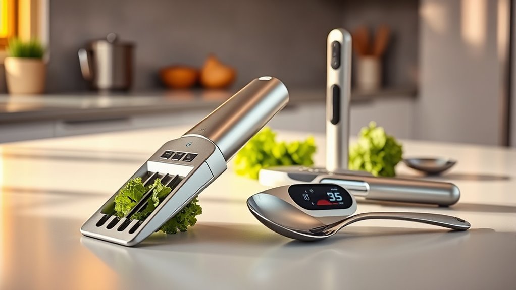 Looking for underrated kitchen gadgets that save time? Try compact, multi-purpose containers and stackable storage to keep your space organized and clutter-free. Ergonomic tools like vegetable peelers and garlic presses can reduce fatigue and make prep easier. Smart gadgets such as adjustable spice racks and knife blocks optimize countertop space. These clever tools streamline your workflow, cut down prep and cleanup time, and make cooking more enjoyable. Keep exploring to discover even more time-saving innovations for your kitchen.