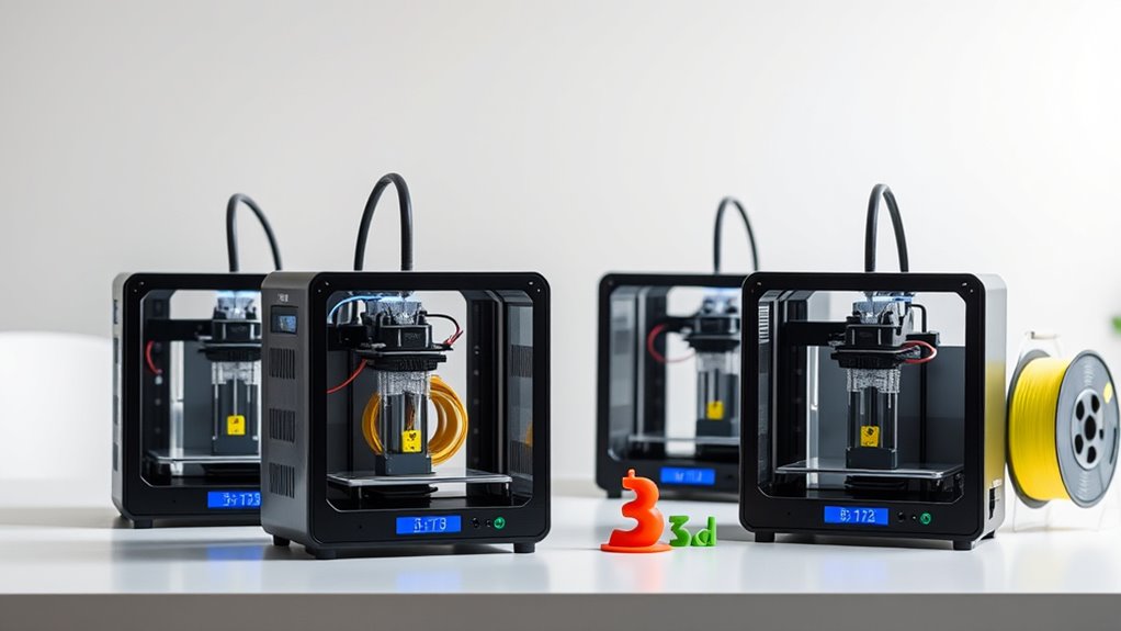 Setting up a 3D printer can be intimidating, but many models under $500 now feature designs that make the process much easier. Most come with pre-assembled parts or require minimal assembly, saving you time and frustration. Auto-leveling beds and intuitive interfaces make calibration straightforward, even for beginners. Clear, step-by-step instructions or quick-start guides help you get your printer up and running without needing extensive technical skills. Features like quick nozzle changes, magnetic build plates, and automatic bed leveling further streamline setup, reducing downtime. Compatibility with user-friendly software and options for remote monitoring also simplify initial configuration and ongoing use. Overall, these design considerations mean you can start printing faster and with less hassle, making 3D printing more accessible for everyone.