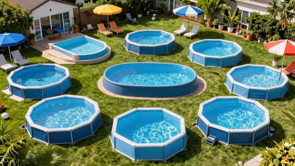 Choosing the right above-ground pool starts with setting a clear budget to guide your options and prevent overspending. I recommend determining your budget range early on, considering not just the initial purchase but also accessories, maintenance, and installation costs. Higher-priced pools tend to use better materials, which means they last longer and may save you money in the long run. Keep in mind that budget constraints might limit your choices in size, shape, or extra features, impacting your overall satisfaction. To get the best value, I suggest comparing prices across multiple sellers and being aware of any hidden costs. This approach ensures you find a pool that fits your financial plan while still providing the durability and features you want.