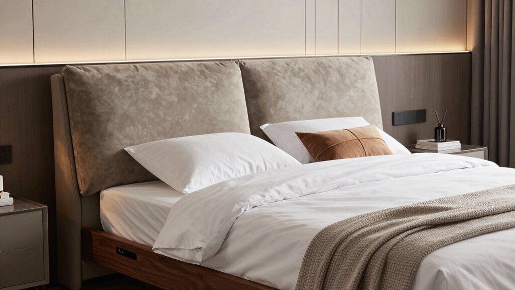 Adding extra comfort features to an adjustable bed can considerably enhance your sleep experience. Features like massage functions help relax muscles, reducing tension and improving sleep quality. Adjustable head and foot inclines let you customize your position for lounging or sleeping, providing tailored comfort. Built-in USB ports and LED lighting add convenience, making it easy to charge devices and create a calming bedroom ambiance. Zero Gravity and anti-snore modes help alleviate pressure points and support better breathing, which is especially beneficial for those with sleep apnea or snoring issues. Additional options like heat therapy, lumbar support, and memory position presets personalize your rest, ensuring your bed adapts perfectly to your needs. These features can turn your bed into a true haven of relaxation.