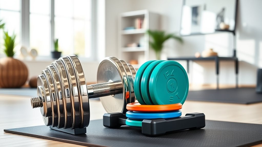 Choosing the right space-saving adjustable dumbbell set is like finding the perfect piece for a puzzle—you want everything to fit seamlessly without clutter. With so many options, you’ll find a set that transforms your home workout corner into a powerhouse. Remember, the right dumbbells don’t just save space; they unleash your potential. So, pick the set that feels just right, and let your fitness journey unfold effortlessly, like a well-oiled machine.