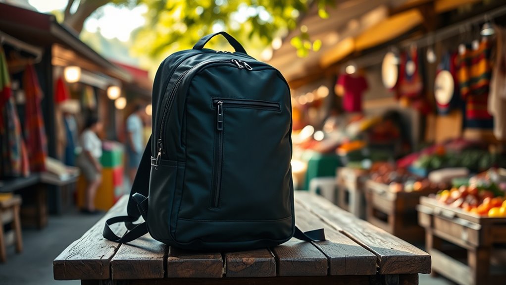 In today’s digital age, integrating tech and security features into your anti-theft backpack is essential for keeping your belongings safe while traveling. Lockable zippers, RFID-blocking pockets, and slash-resistant fabrics protect against unauthorized access and electronic theft. Built-in USB ports and external cable access let you charge devices securely without exposing cables to theft or damage. Security-focused backpacks often include hidden pockets, secret compartments, and rear-facing zippers to deter pickpocketing and unauthorized scans. Many models feature tamper-proof locks, such as TSA-approved or password locks, adding an extra layer of security during transit. Additionally, durable, cut-resistant materials and reinforced stitching help withstand tampering and physical damage. These integrated features are vital for ensuring your belongings stay safe and gives you peace of mind while exploring unfamiliar places.