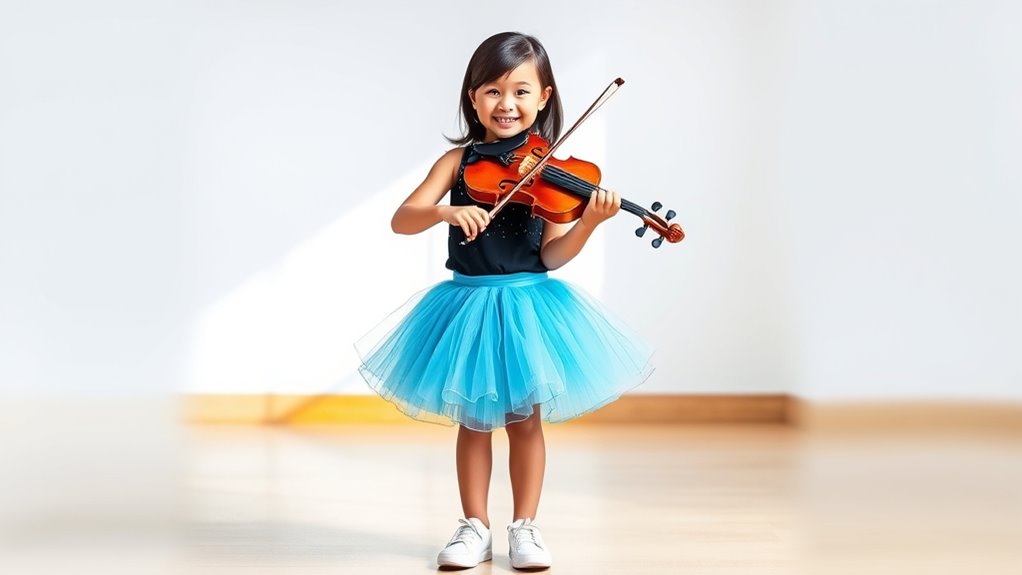 Think of a beginner violin outfit as a garden that needs regular tending. I regularly check the clothing for tears or loose stitches, wash the fabrics gently, and store everything in a cool, dry place to prevent damage. I also make sure the outfit fits well as the child grows and replace any worn-out pieces promptly. Keeping the outfit in good shape guarantees my little learner stays focused on playing, not fussing with their clothes.