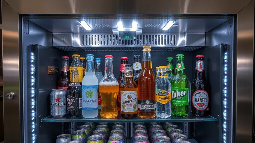 Different cooling technologies in beverage refrigerators substantially impact their efficiency, noise levels, and temperature stability. Compressor-based systems deliver quick cooling, precise temperature control, and are great for larger units, but they tend to be noisier and consume more energy. Thermoelectric coolers operate silently with less vibration, making them perfect for small spaces, although they have limited cooling capacity and less accurate temperature regulation. Air cooling technology circulates cold air within the unit to ensure even temperatures and prevent frost buildup, often found in more advanced models. Frost-free systems automatically manage ice formation, reducing maintenance and maintaining consistent temperatures. Understanding these technologies helps you choose a refrigerator that aligns with your needs for quiet operation, energy efficiency, and reliable cooling performance.
