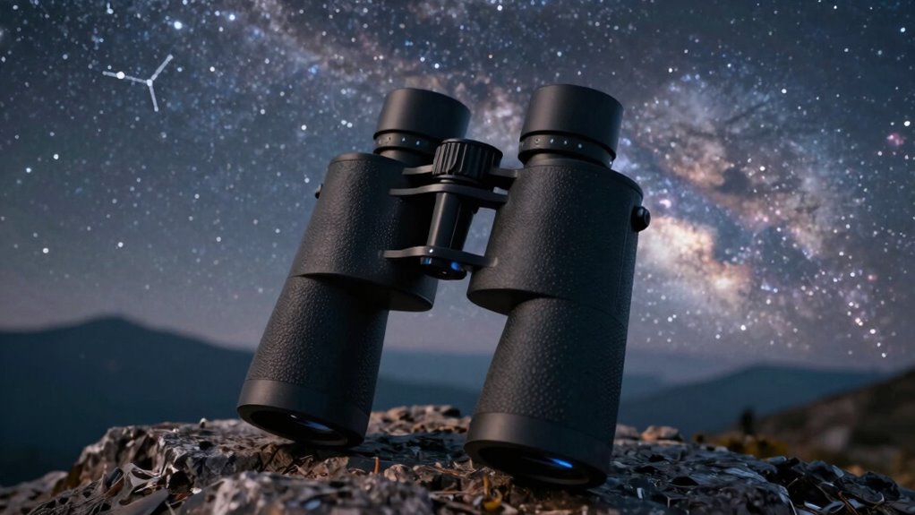 When selecting binoculars for stargazing, I focus on several key factors to make certain a great experience. I consider the right magnification and aperture size, as they directly impact clarity and brightness, while also paying attention to weight and weatherproof features for comfort and durability. Additionally, high-quality optical coatings make a big difference in image sharpness and contrast under the night sky.