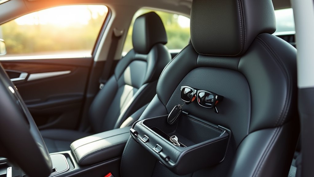 Considering storage capacity is essential when choosing a car seat gap filler, as it determines how well it can hold your essentials. I look for fillers with multiple compartments, slots, or pockets that can store items like my phone, keys, or coins securely. Shallow or semi-rigid designs might limit what I can stash without creating clutter or obstructing my view. Larger, multi-functional fillers often include features like cup holders or hooks, boosting storage options. It’s important to check the internal dimensions and pocket depth, ensuring they fit my items comfortably. A filler with adequate capacity keeps my essentials within reach, reducing the need for extra organizers and helping my car stay tidy and functional.