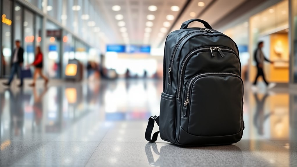 When selecting a carry-on backpack, comfort and ease of carrying should be top priorities, especially if you’ll be on the move for extended periods. Padded shoulder straps and ergonomic back panels help reduce shoulder and back strain, making long walks more manageable. Adjustable straps let you customize the fit for your body and load size, guaranteeing ideal comfort. Lightweight materials prevent fatigue, which is vital during busy airport shifts. Breathable mesh and ventilated panels improve airflow, minimizing sweating and keeping you comfortable. Multiple carrying options, like top handles, side handles, and backpack straps, provide versatility in different situations. Prioritizing these features ensures your travel experience remains comfortable, even during extended journeys or when steering through crowded spaces.