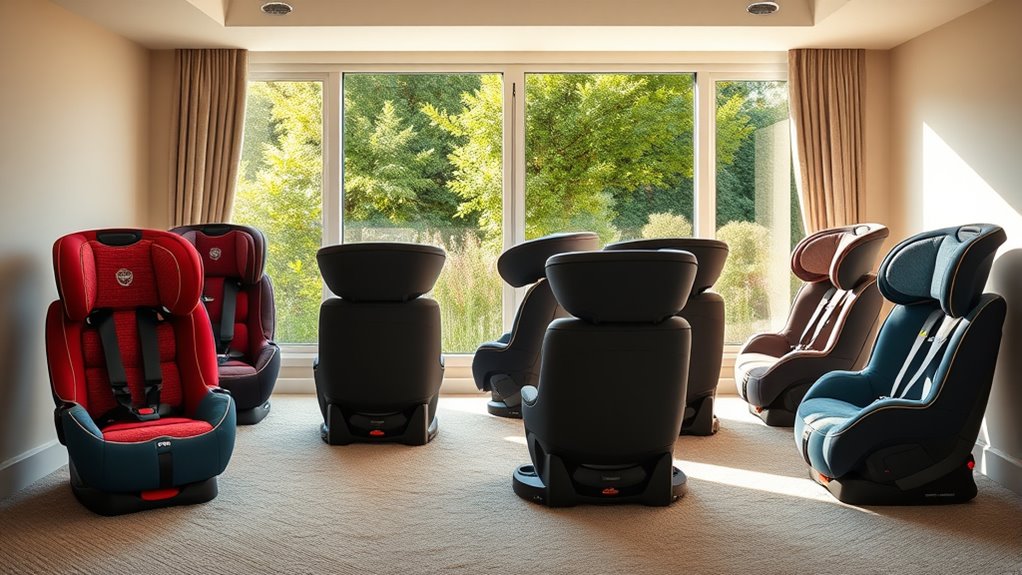 Choosing a convertible car seat that meets safety standards is essential for ensuring your child’s protection during extended rear-facing use. I always check if the seat complies with federal safety standards like FMVSS 213 in the U.S., which sets minimum crash test requirements. It’s also important to choose seats tested at crash energies higher than the industry minimum, offering added safety. I look for models with side-impact protection features, such as energy-absorbing foam or side wings, that meet safety regulations. Verifying independent testing and certification labels helps confirm compliance. Some seats incorporate advanced safety engineering, like steel reinforcements or impact force mitigation systems, designed for prolonged rear-facing safety. Ensuring these standards helps provide peace of mind and ideal protection for your little one.