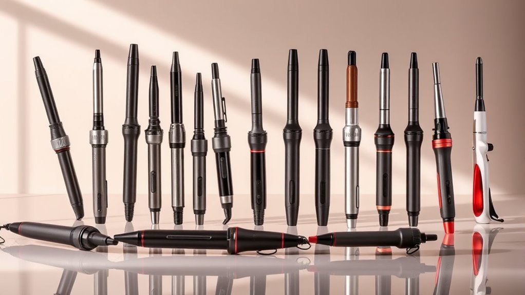 Safety features and thoughtful design are essential considerations when choosing a cordless curling iron, as they directly impact your safety and ease of use. Auto shut-off timers, usually between 8-10 minutes, help prevent overheating and accidental burns if you forget to turn off the device. Anti-scald tips and curved handles reduce the risk of burns while styling, providing safer handling. Secure lock buttons and temperature controls prevent unintentional adjustments, ensuring safe operation during use. Cool-to-the-touch surfaces and heat-insulating materials protect your hands when handling hot tools. Additionally, features like tangle-free cords, tangle detection, and automatic reverse functions minimize hair pulling and tangling risks. Together, these safety-focused design elements give me confidence that I can style effortlessly and safely.