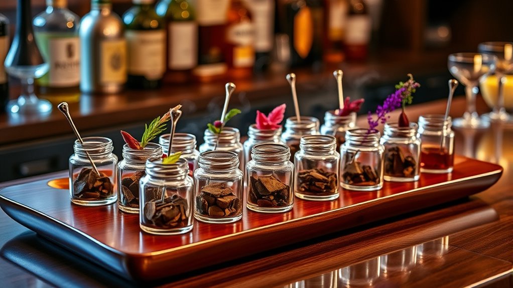 Different wood chip flavors bring distinct smoky aromas and taste profiles to your cocktails and foods. Choosing the right flavor depends on the mood and flavor you want to achieve. Lighter woods like apple and cherry produce milder, fruity smokiness that complements delicate drinks, while denser woods like hickory and oak offer bolder, more robust smoky notes perfect for richer cocktails. Natural, air-dried chips are best because they burn cleaner and provide purer smoke compared to processed options. You can also layer different flavors to create complex profiles tailored to your preferences. Keep in mind that the size and quantity of the chips influence how long and how intensely they smoke; smaller chips ignite quickly but burn out fast, while larger ones offer longer-lasting, subtler smoke.