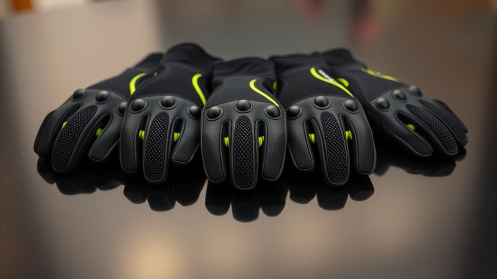 A well-fitting, comfortable glove is just the start; good airflow is key to maintaining dry, comfortable hands during your ride. Breathability comes from fabrics like mesh or Lycra that allow air to circulate and wick moisture away from your skin. Ventilation holes or perforations in the glove material substantially improve moisture management and reduce sweating, keeping your hands dry and fresh. Many gloves also feature moisture-wicking inner linings that draw sweat away, preventing skin irritation and odor buildup. Ventilated back panels or mesh inserts are especially beneficial in hot weather, promoting cooling during vigorous rides. Proper airflow not only enhances comfort but also helps prevent skin irritation, making your cycling experience more enjoyable, especially on longer, sweat-inducing rides.