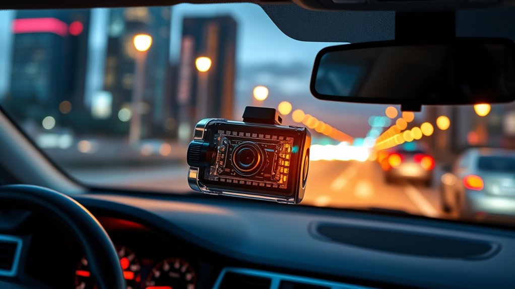 When choosing a dash cam, parking mode features play a essential role in ensuring your vehicle’s security while unattended. These features often include motion detection, impact alerts, and time-lapse recording, helping monitor your car even when you’re away. Many models require a hardwire kit or constant power source to operate 24/7 without draining your battery, providing continuous surveillance. Some dash cams automatically record short clips upon impact and lock them to prevent overwriting, which is critical for insurance claims. Customizable settings allow activation based on motion, impact, or both, fitting your security needs. The effectiveness of parking mode depends on sensor sensitivity, storage capacity, and support for low-voltage protection to avoid draining your vehicle’s battery.