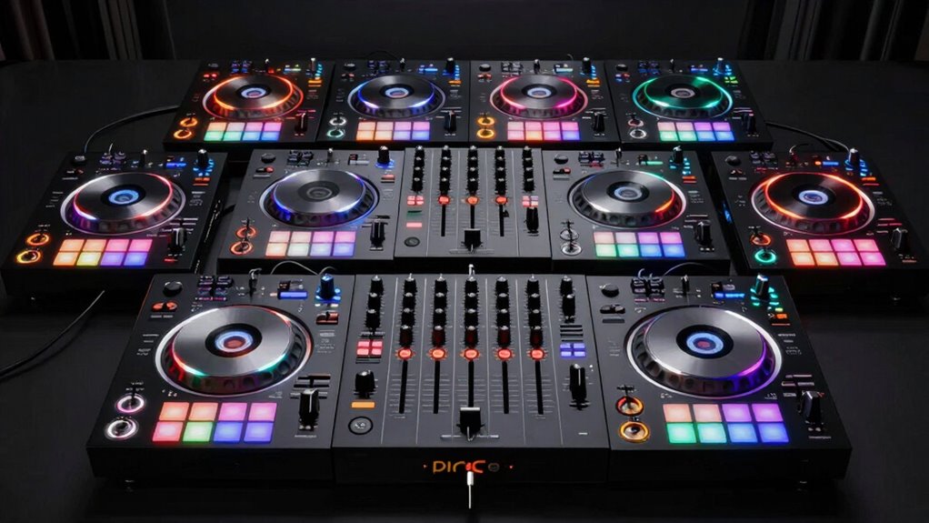If you’re looking for the 15 best DJ controllers for scratching in 2026, I suggest checking out models like Pioneer DDJ-FLX2, Numark Mixtrack Pro FX, Rane ONE MKII, and Pioneer DDJ-REV5. These offer excellent jog wheels, durable build quality, and seamless software integration, making them perfect for turntablism. Compact options like Numark Party Mix II are great for portability, while larger controllers give more tactile control. Stay with me to explore each option in more detail.