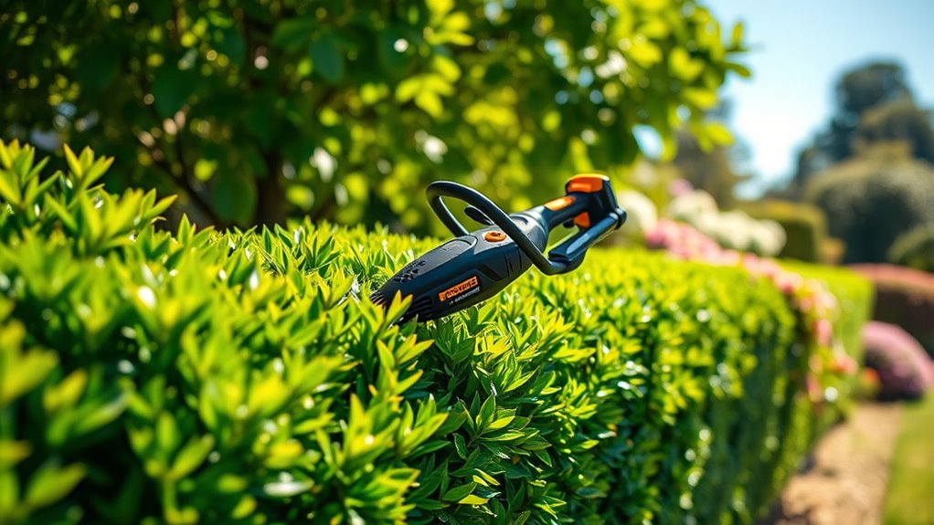 Looking for the best cordless electric hedge trimmers in 2025? I’ve tested top models like the BLACK+DECKER 20V MAX, WORX WG261, and EGO Power+ for their power, battery life, and safety features. These tools are lightweight, easy to handle, and perfect for precise trimming of medium hedges. Some even come with dual batteries for longer use. Keep exploring for tips on choosing the right one to keep your garden looking pristine.
