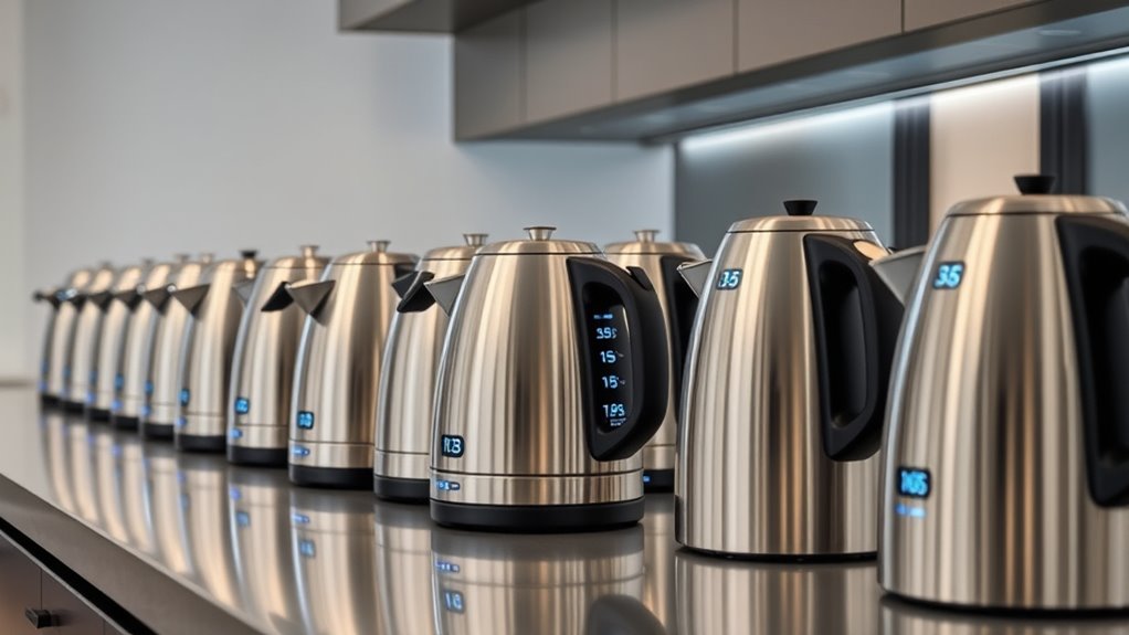 When searching for the best electric kettles with precise temperature control, I look for models offering multiple presets, digital displays, and quick heating. These kettles make it easy to brew tea or coffee at the perfect temperature, with safety features like auto shut-off and boil-dry protection. Modern designs and user-friendly controls also matter to me. Keep exploring, and you’ll find detailed insights into the top options that can elevate your brewing experience.