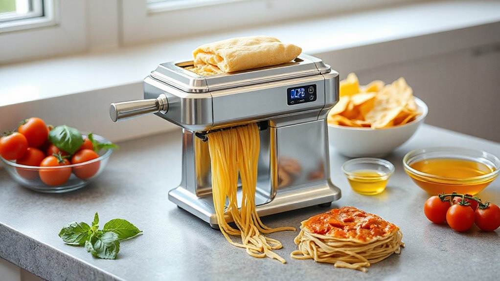 Since the durability of an electric pasta maker directly affects its longevity, it’s vital to take into account the materials used in its construction. High-quality, corrosion-resistant materials like stainless steel ensure the machine can withstand frequent use and cleaning without rusting or wearing down. Food-grade materials are essential for safety and hygiene, preventing contamination during pasta prep. A sturdy shell made from solid materials minimizes vibrations and noise, which also contributes to overall durability. Regular maintenance and proper cleaning of these durable materials can greatly extend the lifespan and keep the machine performing at its best. Choosing a pasta maker built with robust, high-grade materials means you’re investing in a reliable appliance that will serve you well for years to come.