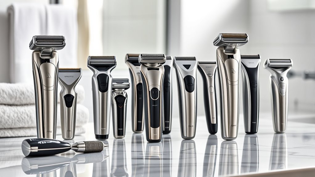 Think of a sensitive skin shaver as a gentle river current—smooth, careful, and precise. Look for features like flexible heads that adapt to contours, hypoallergenic blades to prevent irritation, and a gentle, low-speed setting that minimizes tugging. These features act like a soft touch, ensuring your skin stays calm and smooth. Choosing the right shaver with these qualities makes your grooming routine effortless and irritation-free.