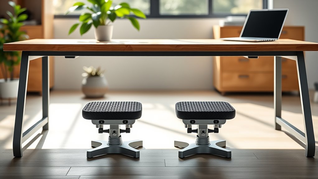 Have you considered how massage and support features can enhance your comfort during long hours at your desk? These features, like rollers, textured surfaces, or pressure point nodes, can stimulate foot nerves, improve circulation, and reduce fatigue. Supportive massage elements help ease foot soreness and promote relaxation, making extended sitting more comfortable. Many footrests offer adjustable massage surfaces, so you can customize the intensity and target specific areas for personalized relief. Incorporating these features can boost circulation, decrease stiffness, and prevent numbness or tingling in your feet. Keep in mind, the effectiveness depends on the design, material quality, and how well the features match your ergonomic needs. Choosing a footrest with the right massage and support features can profoundly improve your comfort and overall well-being.