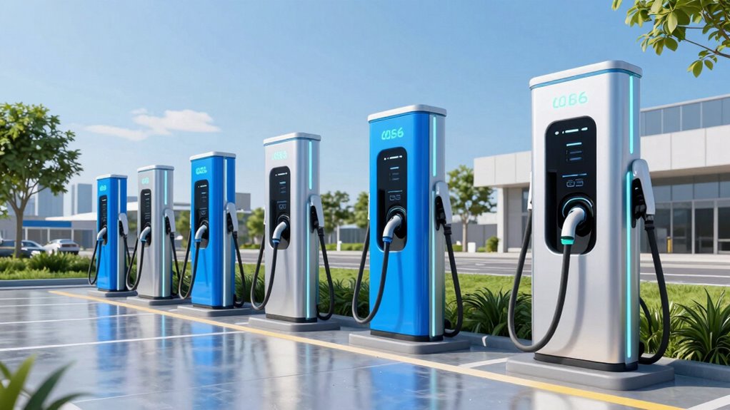 I’m excited to share some top EV charging stations for 2026 that offer fast, reliable power with features like Wi-Fi, adjustable current, and weather-resistant design. From portable units to commercial models, these chargers support 40A to 50A power levels, ensuring quick charging with J1772 connectors compatible with most EVs. Whether for home or business use, these options combine safety, smart features, and durability. Keep going to discover which station fits your needs best!