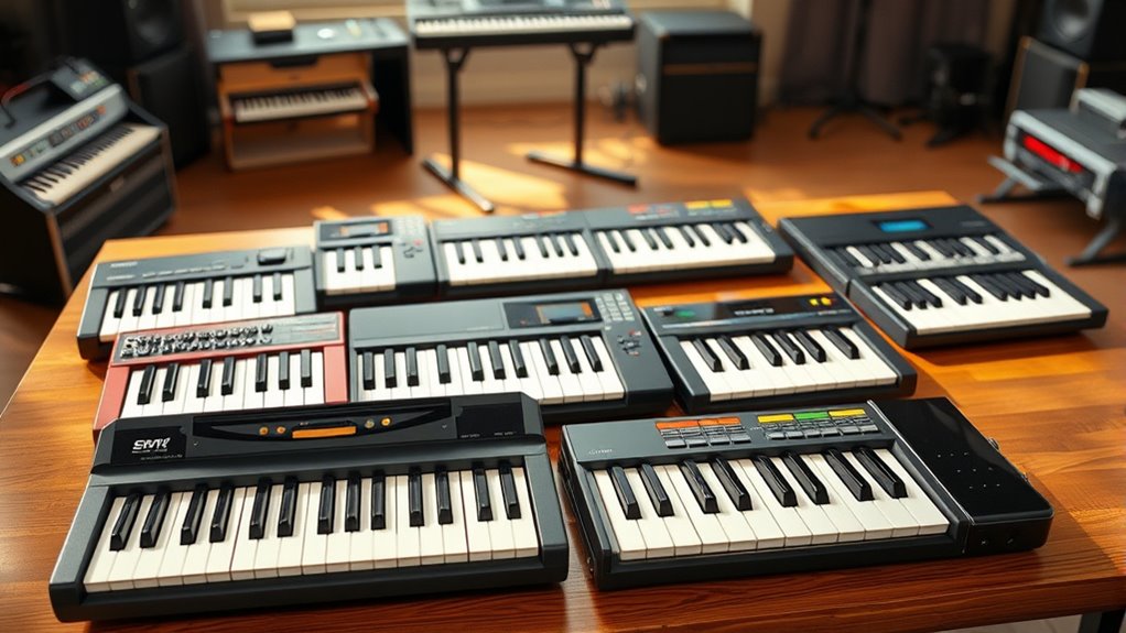 Choosing the right key feel is essential because it directly affects how natural and expressive your playing will be on a foldable electric piano. The key action—whether semi-weighted, weighted, or non-weighted—shapes your tactile feedback and responsiveness. Fully weighted keys mimic acoustic pianos, offering resistance that helps develop proper finger strength and control, making your playing more realistic. Semi-weighted keys strike a balance, providing a lighter feel suited for players shifting from beginner to intermediate. Non-weighted keys, often toy-like, lack the tactile feedback necessary for proper technique, which can hinder progress. Responsiveness, including velocity sensitivity and rebound, is also vital for expressiveness. Overall, choosing an action that aligns with your skill level and playing style will enhance your performance and enjoyment.