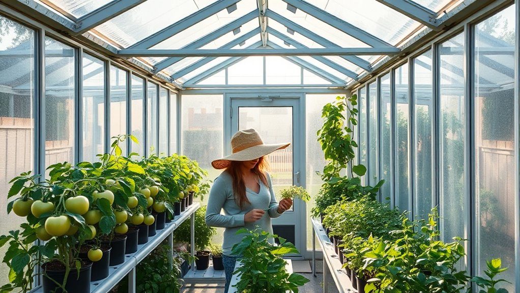 To guarantee proper ventilation in my greenhouse kit, I open vents regularly and install exhaust fans to promote airflow. I position vents on opposite sides to create a natural cross-flow, preventing humidity buildup and overheating. I also keep doors slightly ajar during the day. Regularly monitoring temperature and humidity helps me adjust ventilation as needed, keeping my plants healthy and thriving all year round.