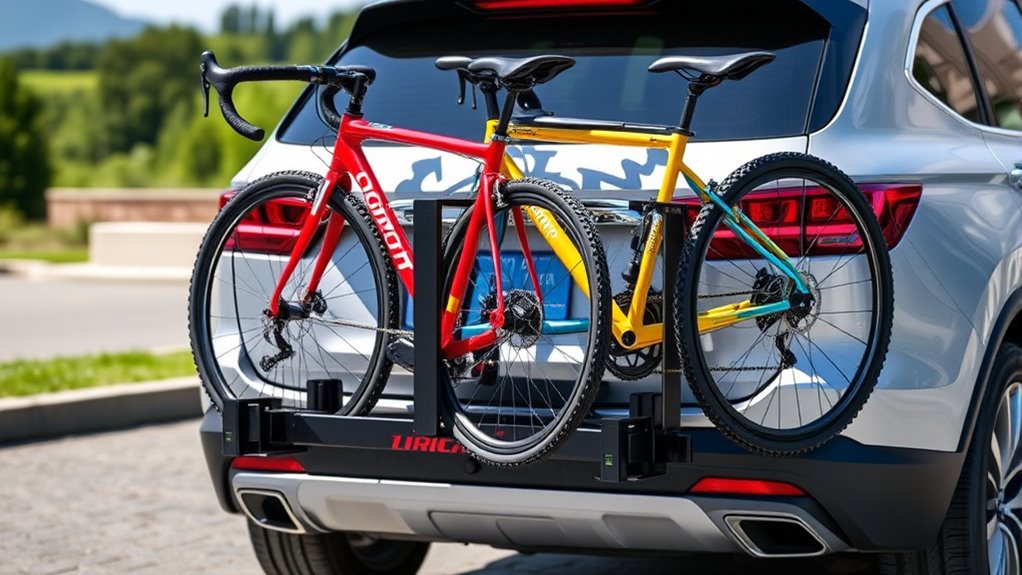 Selecting a hitch-mounted bike rack that fits your SUV’s needs starts with verifying its compatibility with your bikes’ frame styles. I look for racks that support various frame geometries, including horizontal top tubes and alternative designs with crossbars. It’s important that the rack’s cradles and straps are adjustable to accommodate bikes with unique shapes like step-through or sloped top tubes. I also consider whether it can handle different frame sizes, from small road bikes to larger mountain or fat-tire bikes. Protecting my bikes’ paint and finishes matters, so I choose racks with secure, non-scratching contact points. Ensuring compatibility with various frame materials and types gives me confidence that my bikes will stay secure and protected during every trip.