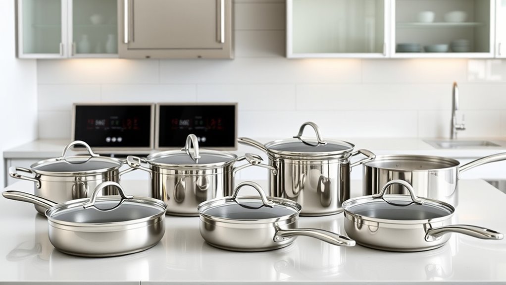 Choosing the right induction cookware set starts with guaranteeing it’s compatible with your stove. Induction cookware needs a magnetic base, usually made of ferrous metals like cast iron or certain stainless steels, to work effectively. Not all stainless steel pans are induction-ready; check if they’re labeled as compatible or test with a magnet—if it sticks firmly, it’s a good sign. A strong magnetic base ensures efficient heat transfer and responsiveness. Aluminum, copper, and glass cookware typically don’t work unless they have a magnetic layer built in. Additionally, look for flat, smooth bottoms that make full contact with the cooktop surface. This maximizes energy efficiency and promotes even heating, both essential for a smooth cooking experience.