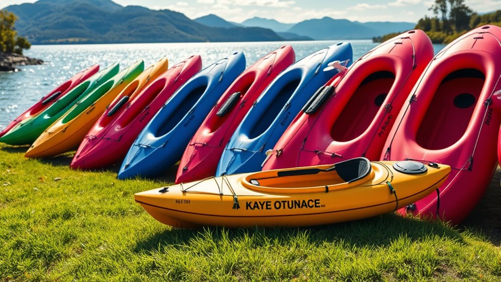 A kayak’s stability and balance directly impact how confidently I can paddle and enjoy the water. A wider beam and flat-bottomed hull design markedly boost stability, helping prevent wobbling or tipping. Features like multiple air chambers and reinforced sidewalls add extra security, especially in turbulent conditions, by maintaining balance. Stabilizing fins or skegs improve tracking and help me stay on course, which enhances overall balance. A low center of gravity, often achieved with adjustable or padded seats, keeps the kayak stable during paddling or turns. Proper inflation pressure and even weight distribution are essential; they ensure the kayak remains steady and minimize the risk of capsizing. Overall, these factors create a stable platform, making the paddling experience safer and more enjoyable.