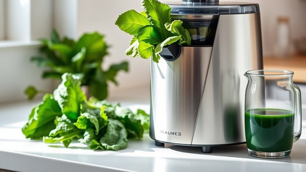 Juicers preserve the nutrient content of leafy greens by minimizing heat and oxidation during the extraction process. I prefer masticating juicers because they operate slowly, reducing nutrient loss and preventing oxidation that can degrade vitamins. This gentle method guarantees my greens stay vibrant and nutrient-rich. Plus, these juicers extract more juice from leafy greens, maximizing nutritional benefits and keeping my drinks fresh, flavorful, and packed with nutrients.